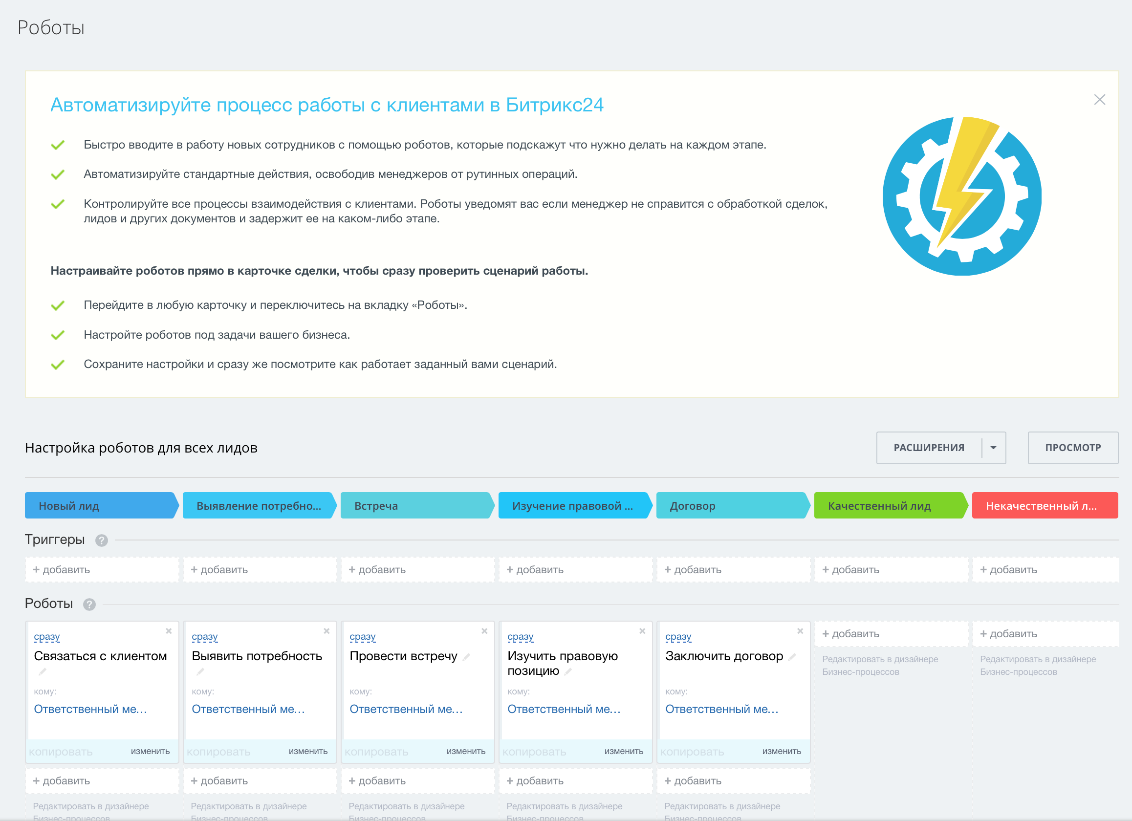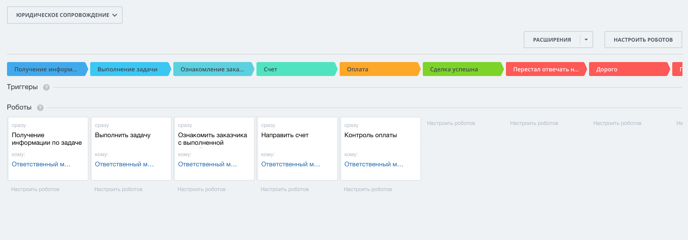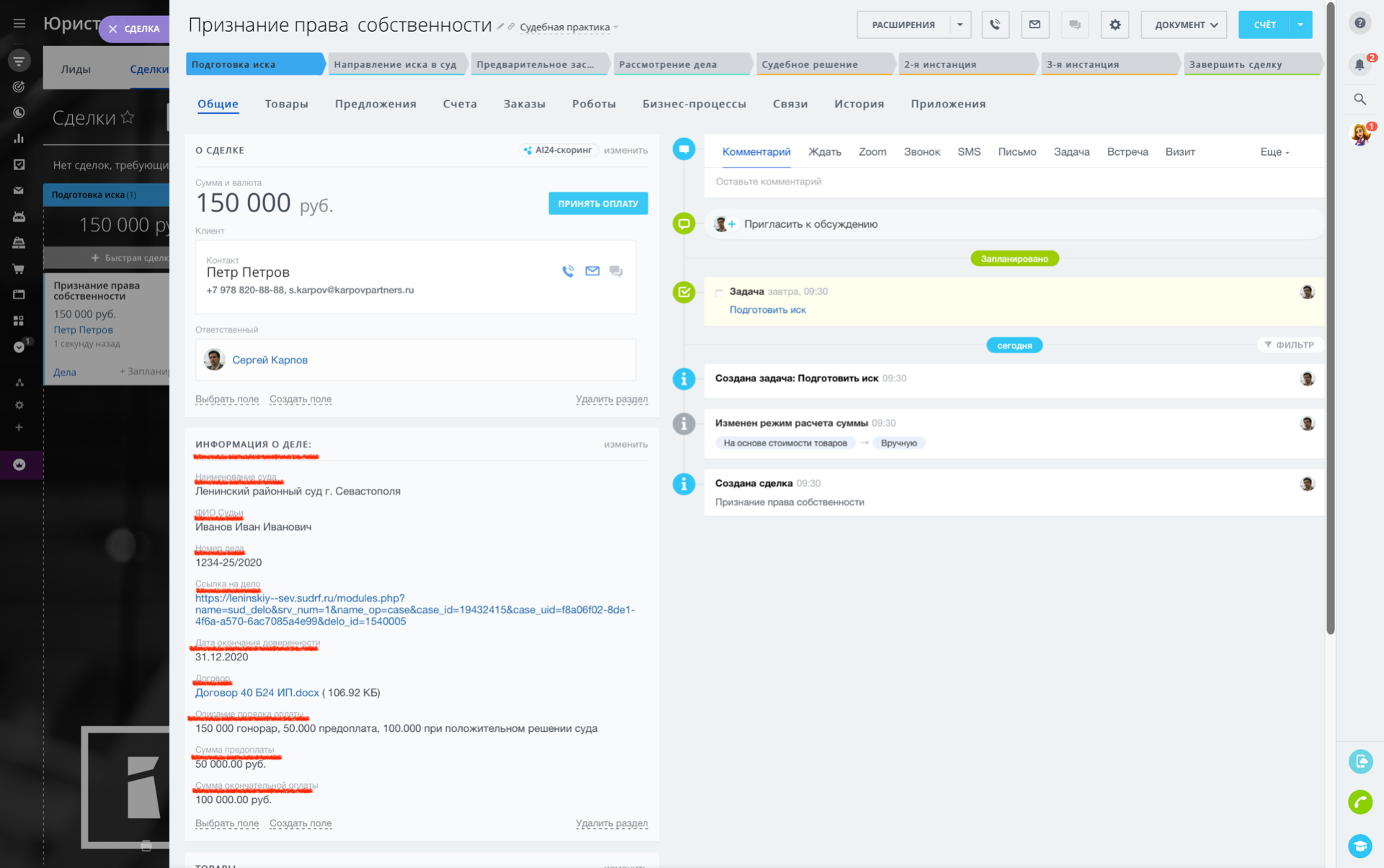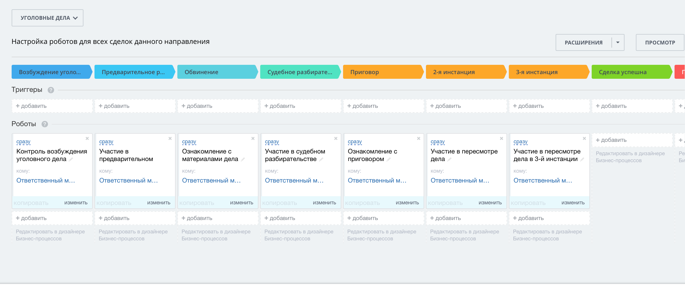 Работа в системе сразу будет происходить по уже известным Вам сценариям, со знакомой терминологией. Воронки продаж, пользовательские поля, бизнес-процессы, - всё для юридической практики.
